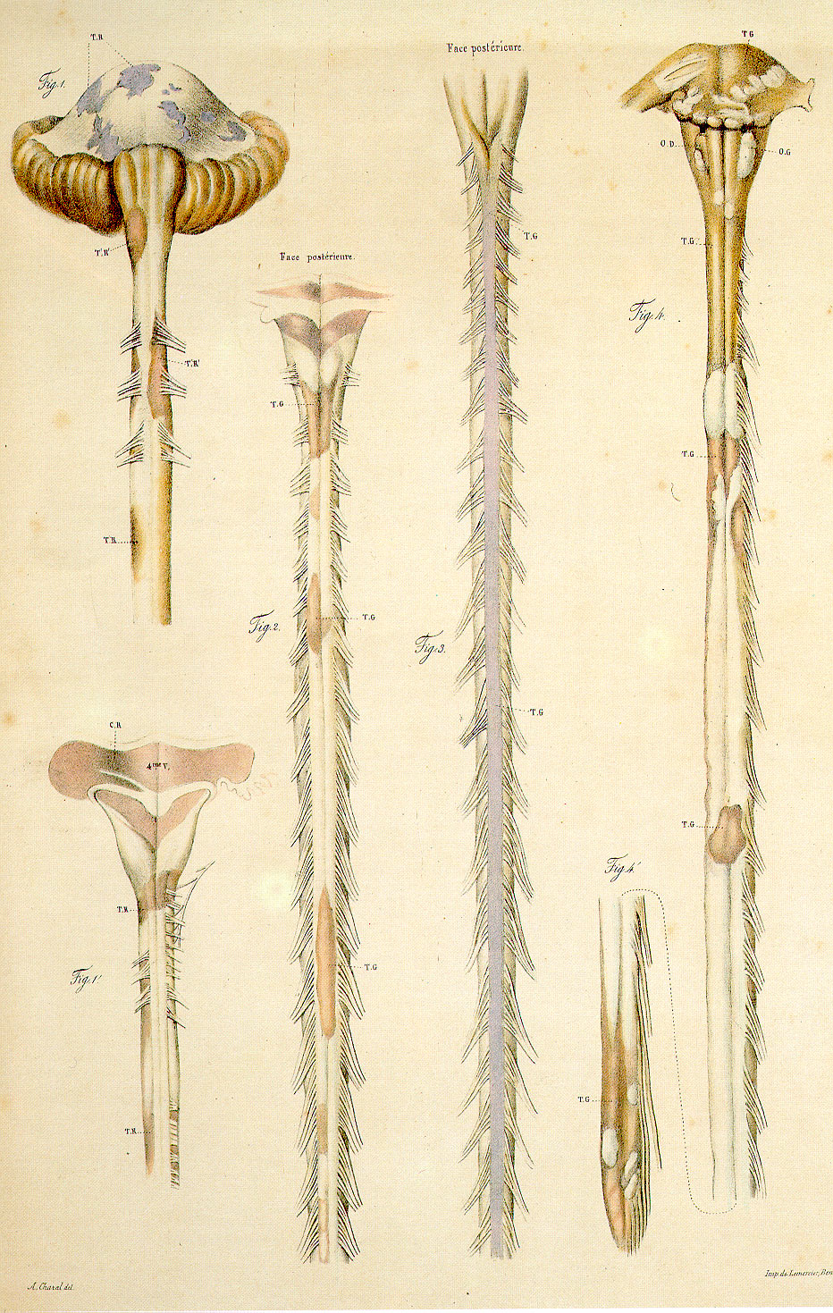 Cruveilhier’s “four cases of grey degeneration of the columns of the spinal cord, by way of a reddish (T.R) or grey (T.G.) [tissue] transformation in the form of