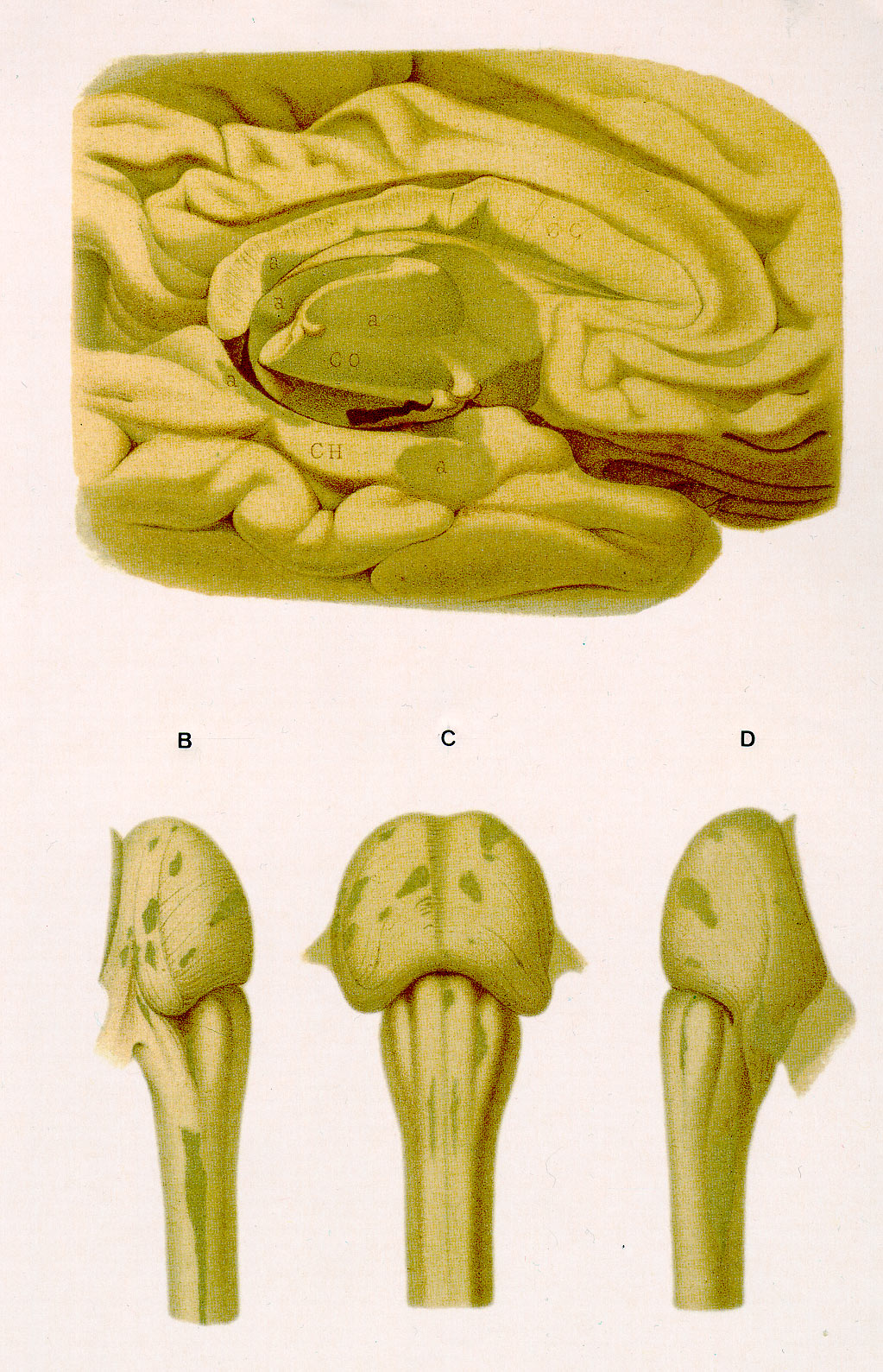Figg. B,C,D. "Sclerosed plaques" on spinal bulb and pons (dark, olive-green