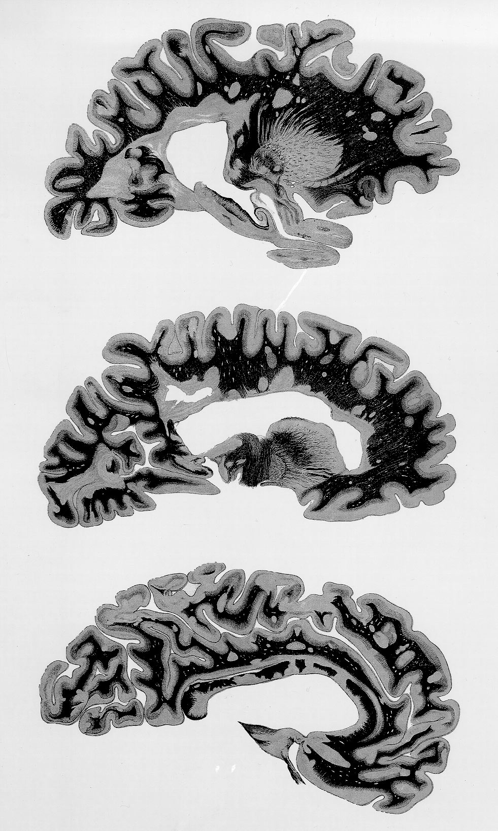 Siemerling and Raecke's Original Description: The cerebral hemisphere's paramedian sections show "extensive plaques, strongly involving, even penetrating the corpus callosum" (lower figure); "many others affect both cerebral white matter and cortex; the most strongly sclerosed, i.e. scarred, areas are in the ventricle walls" .
